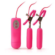 Tempting nipple clamps deliver fabulous sensitivity for her with the vibe and the heating feature, along with teasing him with vibration as he plows the voluptuous valley between her breasts.