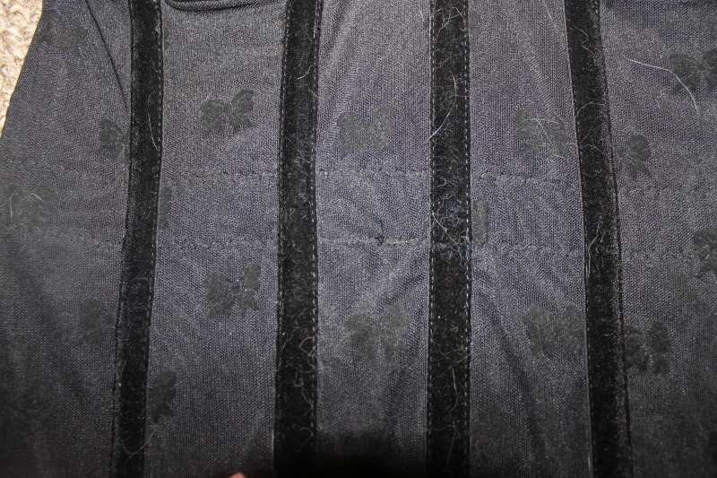 As for my experience, it was rather good. Usually I order a size XL, but decided to order the large because often times the XL leaves me with a bit too much room in the chest area. I wear a C38 and the chest area fit me well. I had the bustier done up on the loosest row of eye closures. I had to get my partner to do the bustier up on me, and he pulled it a bit tight and the material ripped a bit on the back. I’ll have to sew this up and hopefully it doesn’t happen again. You can see this in the photo I’ve posted below.