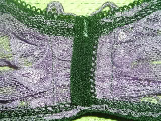 The backside of the garment is formed by the classic T-shape arrangement of the elastic and one of the butterfly appliques is sewn on top of the elastic bands where they intersect. Since there is nothing to anchor the lateral tail of the butterfly, I have noted that it tends to curl after washing. This can be remedied with an iron on low heat. But the curling has not been too bad so far.