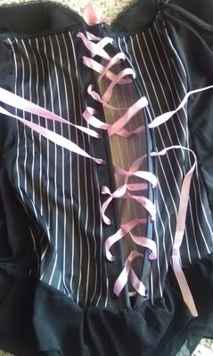 Pinstripes, lace, bows, and pink ribbons come together in a flirty, provocative way to make this piece of lingerie a keeper. High-quality materials and a superb design flatter any body type, and the corseted back enable this to give nearly any body type the perfect fit. Now, if only these pinstripes counted for business-attire. Casual Friday, anyone?